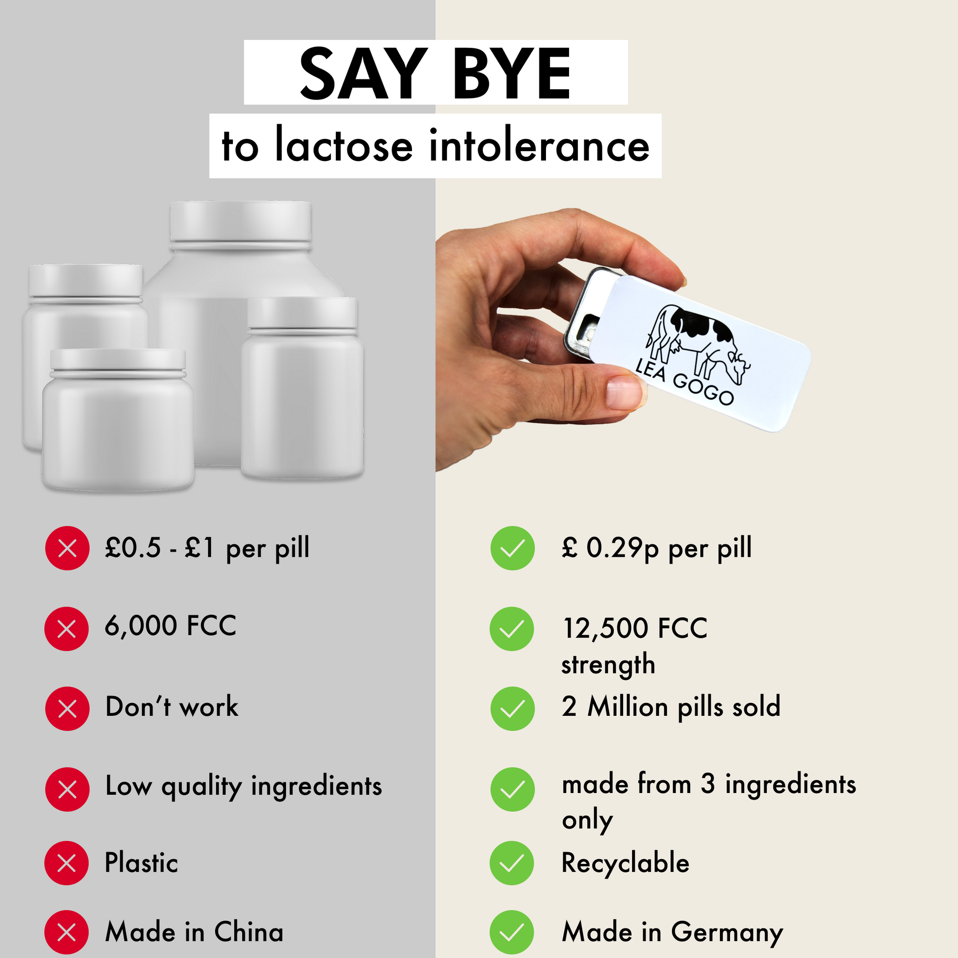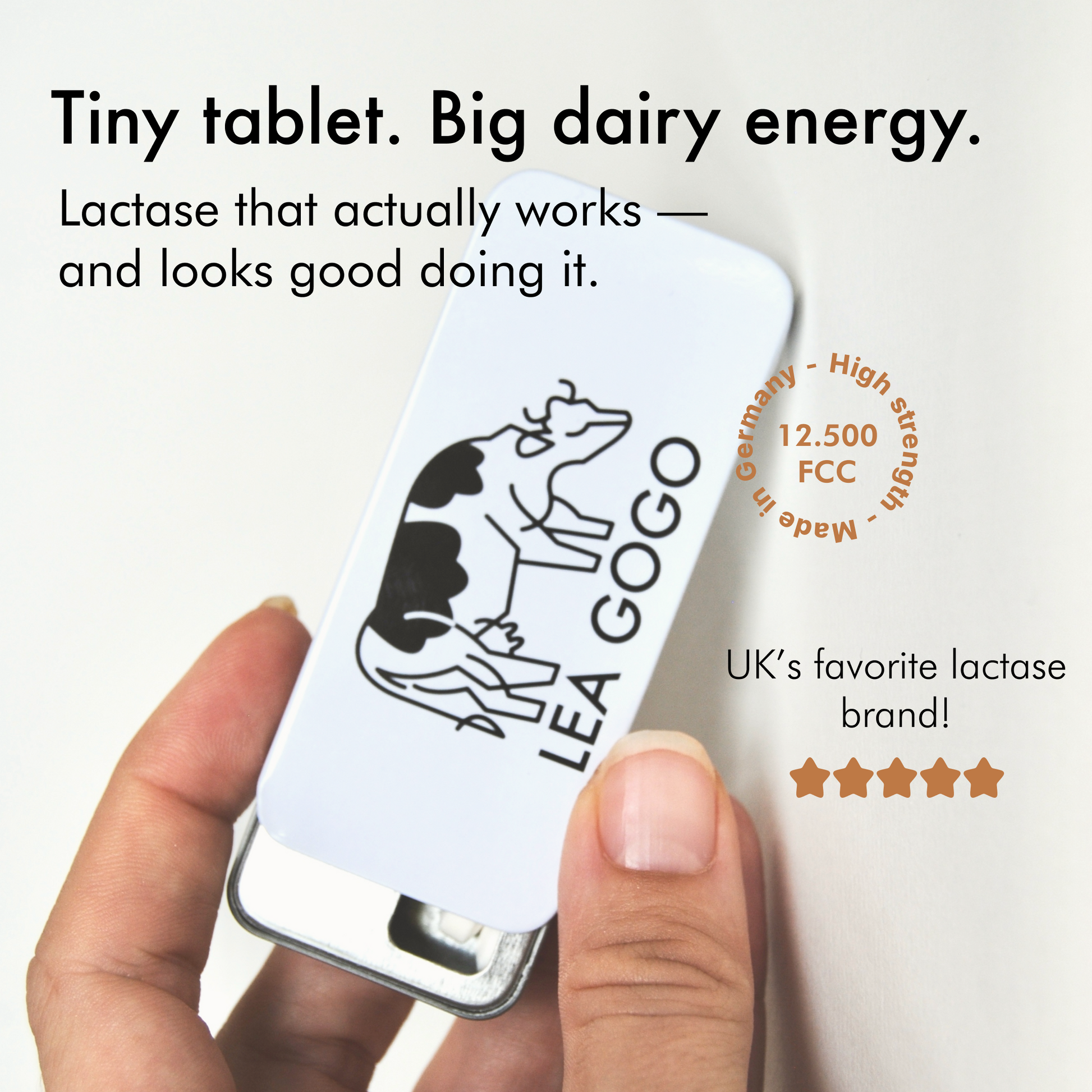 La caja de Lea Gogo contiene 40 tabletas de lactasa con una concentración de 12.500 FCC (Food Chemical Codex) cada una. La concentración es un indicador de la cantidad de lactosa que se puede dividir en una tableta.